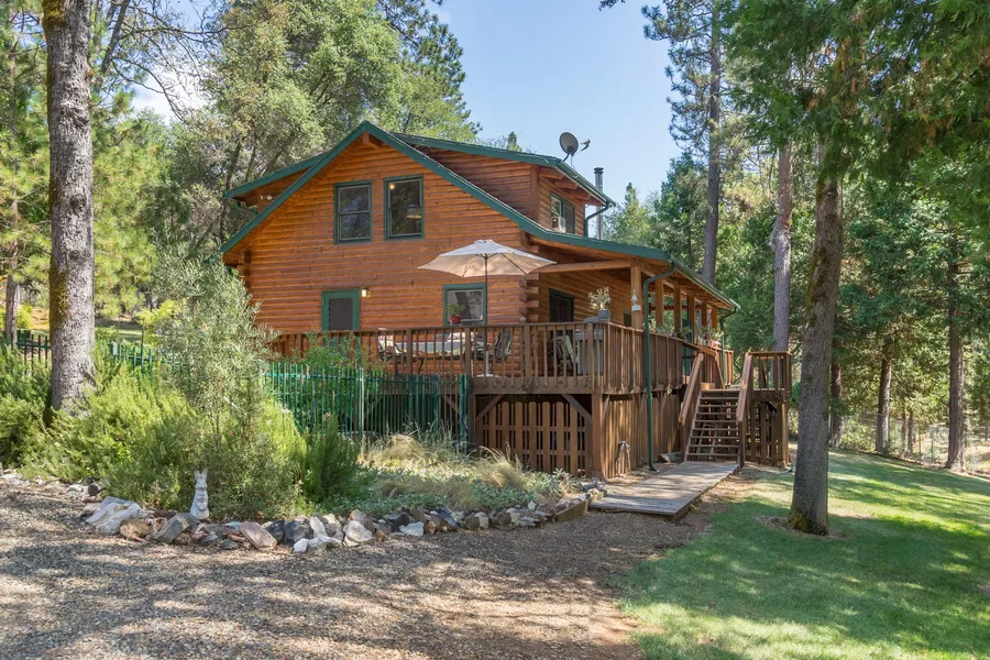 Gorgeous custom log home on 13 spectacular acres. The ultimate private setting, surrounded by mature landscaping, lush lawns, expansive gardens, large oaks and pines. The home offers, vaulted ceiling, open floor plan, with loft. Decks, patios and walkways meander through the yard. The sparking pool and personal spa is an extra bonus. 3 car detached garage with lots of storage, covered RV storage, tool shed with extended cover. Garden, fruit trees and more. Come live the foothill dream!