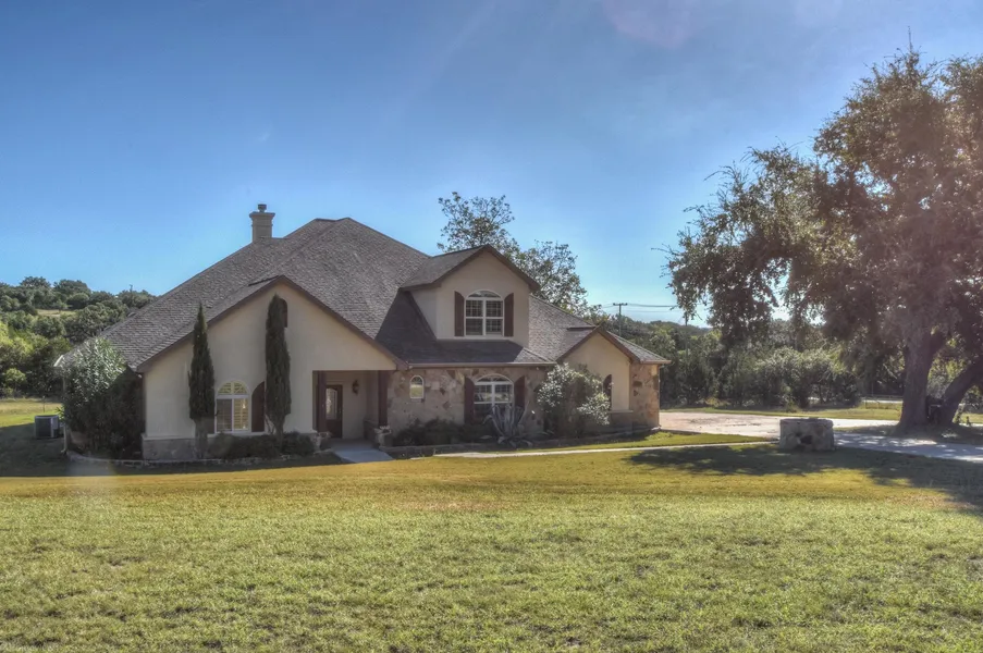 Immaculate Custom Stone and Stucco home on 3 pristine level acres, very private. Home has 3 bedrooms 3 baths down, one of which is guest room with private bath and entry. Large living area with built-in book cases, beautiful office with french doors, master suite is over sized and master bath has a true spa feel with separate walk-in shower and tub. The kitchen is a chef's dream with oversized center island, alderwood custom cabinets, walkin pantry, stainless appliances, stone back splash, granite counters. Two additional oversized bedrooms upstairs with media room.