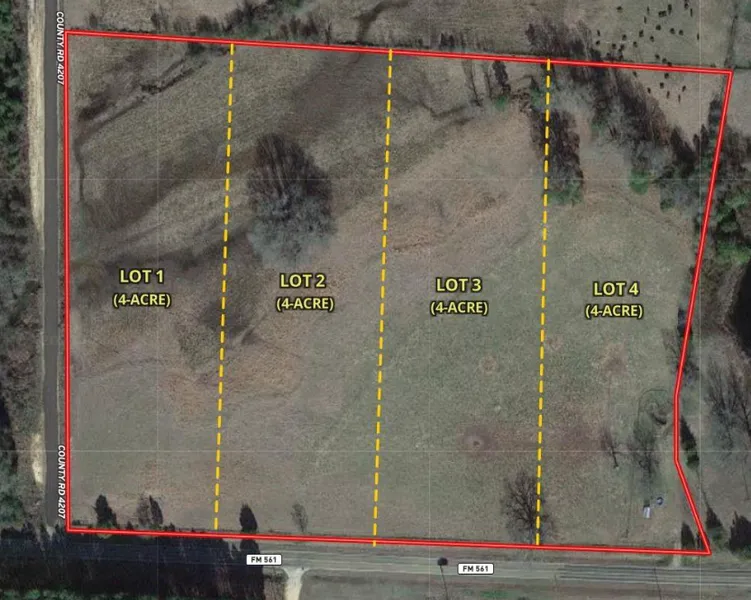 Beautiful 17-acre property with gated access! This property is also being sold in 4 acre tracts for $49,000 each. Recent survey available. Close to town and major highways yet secluded enough to offer peace and quiet at your new homesite or weekend getaway spot. Perfect area for building, utilities available at the road. This 17-acre property (all four, 4-acre tracts) has road frontage on FM 561, and Lot 1 is on the corner of FM 561 and CR 4207. This property offers tons of greenery as it is home to several types of trees and offers plenty of open space with flourishing green grass and beautiful views. The perfect peaceful getaway! Ag Exempt. Owner financing guaranteed with 20% down 10.9% APR for up to 15 years. See photos for plat map.