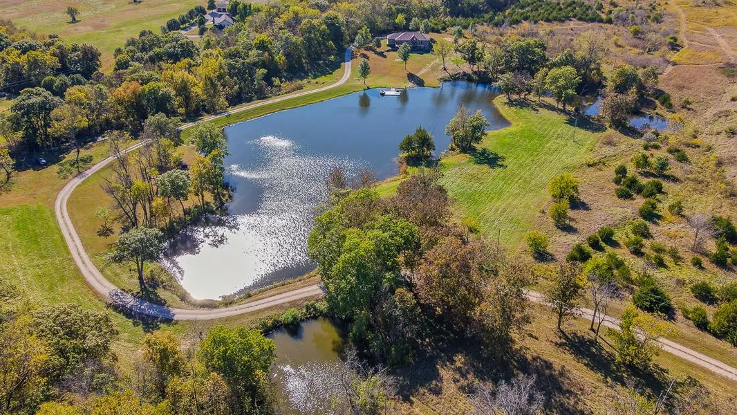 From that 4 BR 3 BA approximately 3600 sf home you watch deer and turkey walk the land. You watch waterfowl circle and maple leaf into the water. You watch fish come to the surface and jump. You watch the seasons change, the foliage change color, and do all this in the privacy of your retreat, away from noise, and crowds, yet only a short drive into the metro KC area, Lawrence, Leavenworth, or Topeka.