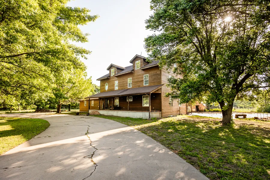 Located on Plum Avenue is a beautiful custom home, ready for its next owners. Built in 1996, the home boasts spacious rooms, a wide floor plan, and incredible character. The 5,376 square foot house has 6 full bedrooms and 4 bathrooms, an attached garage, and a finished basement. This would make the perfect fit for having several children, visiting friends, or a multi-generational family. The rustic charm of the house is undeniable, with large exposed beams, vaulted timbered ceilings, and log accent walls in the Great Room that are one-of-a-kind. There is a built-in wet bar and brick hearth, made for entertaining. Custom masonry and hardwood molding are features throughout the home. A true main-floor master bedroom includes sliding barn doors, an oversized bath, and a walkout patio. On the back porch exterior, there is stone siding from the nearby Santa Fe Trail Corral, famously inhabited by Buffalo Bill and General Custer. The home has received numerous recent upgrades, including new or refurbished flooring, new lighting, fresh painting, a complete bathroom/shower renovation, and outdoor decking and stairs. The circle driveway brings you in off the blacktop and is adorned with magnificent shade trees. These planted oak trees and Pines provide excellent shade on the west-facing front door and make for comfortable nights watching the sunset on the covered front veranda.