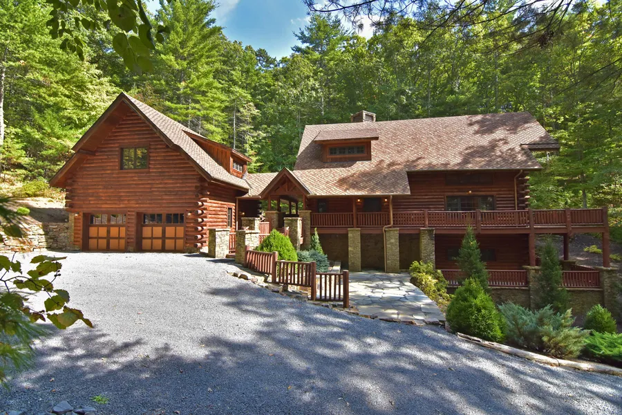 A private drive winds through the woods to the home, sited to take advantage of its tranquil forest setting. Stone terraces, pillars and walls offset the log structure, which is further enhanced by triple-thick dimensional roof shingles with a life-time warranty and simulating t...
