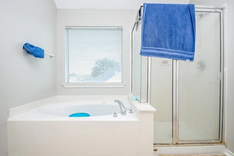 All bedrooms are generously sized and equipped with ceiling fans for added comfort. The oversized primary suite includes a relaxing whirlpool tub, separate shower, double sinks, and a walk-in closet. The secondary bathroom also features double sinks, offering added convenience.