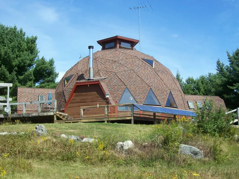 Live on or off the grid in this super-efficient home offering eleven rooms, three bedrooms, two baths w/4000 sq. ft. of living space. The geodesic dome on 18.9 private acres with over 800' feet of shore frontage on Great Pond. This home is totally self-sufficient with solar, wind power, propane generator off grid or on the grid. This super insulated home heats with just three cords of wood per season from the wood burning furnace in the fireplace. The property offers a greenhouse, garden area, forests, trails, a sand beach, native blueberries, and abundant wildlife. The dome offers a two car garage with direct entrance to the home, expansive deck, open concept living room, kitchen, and dining area. An observation area on the third level offers bird?s eye views of the surrounding forests, mountains, lakes, and wildlife. Enjoy hiking, horseback riding, biking, ATVing and snowmobiling with ...