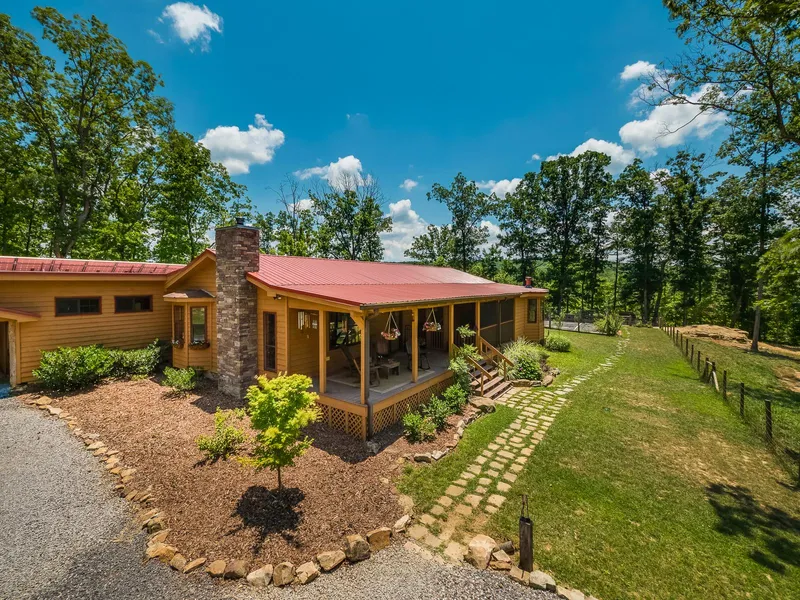 Enter from the inviting covered porch into the family room with stacked stone fireplace and knotty heart pine floors that run throughout home. The sliding barn-wood door accents the entry to the spacious kitchen/dining areas. The fabulous eat-in-kitchen boasts granite counter tops, new appliances, bay window with seating, custom hickory bar, and an extra-large pantry. It flows into a lovely dining room with French doors leading to quiet back yard with winter mountain views. A second sliding barn door leads to an attractive and practical mud room/laundry area adjacent to an attached double carport.The huge master suite features a large walk-in closet, double sinks and vanities, a bay window with peaceful views of the pond and pasture, a wood-burning stove, and French doors leading to a cozy screened porch. Two additional bedrooms share another full bathroom in main hallway.