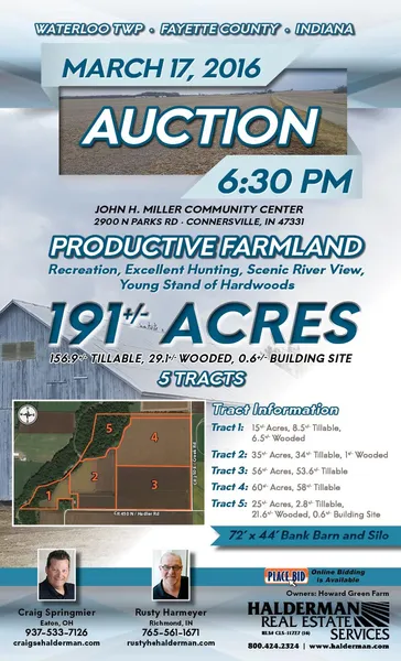 Legal Description: 191 acres, more or less, located in part of the NE 1/4 and NW 1/4 of S32, T15N, R13E, Waterloo Twp, Fayette County, State of Indiana.