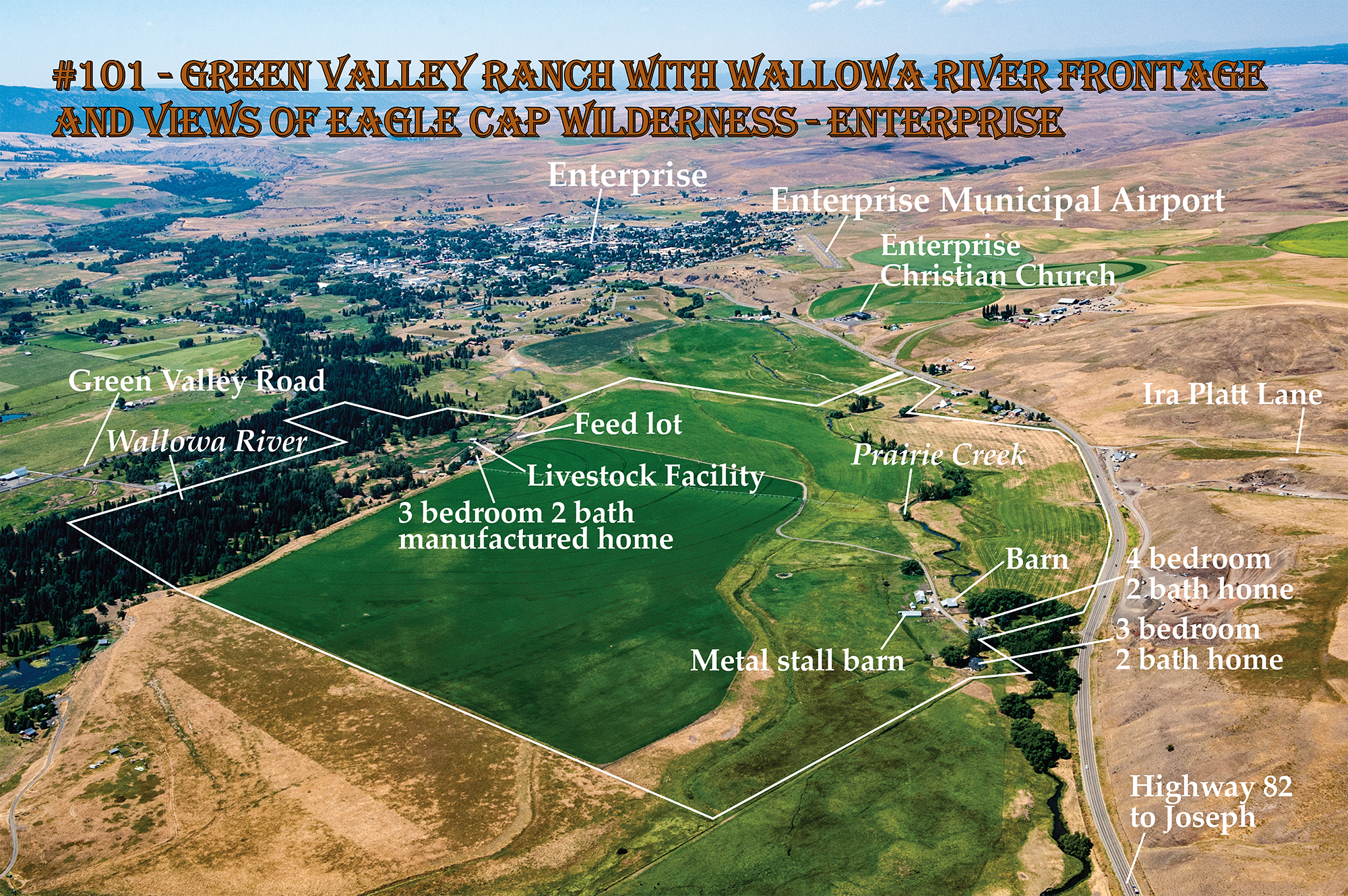 The 372 acre Green Valley Ranch is located midpoint between Enterprise and Joseph, along Highway 82, with magnificent views west to the Wallowa Mountains and Eagle Cap Wilderness. The Ranch has over a half mile of Wallowa River frontage in the southwest section of the property, and three-quarters of a mile of Prairie Creek frontage in the northeast section of the Ranch.