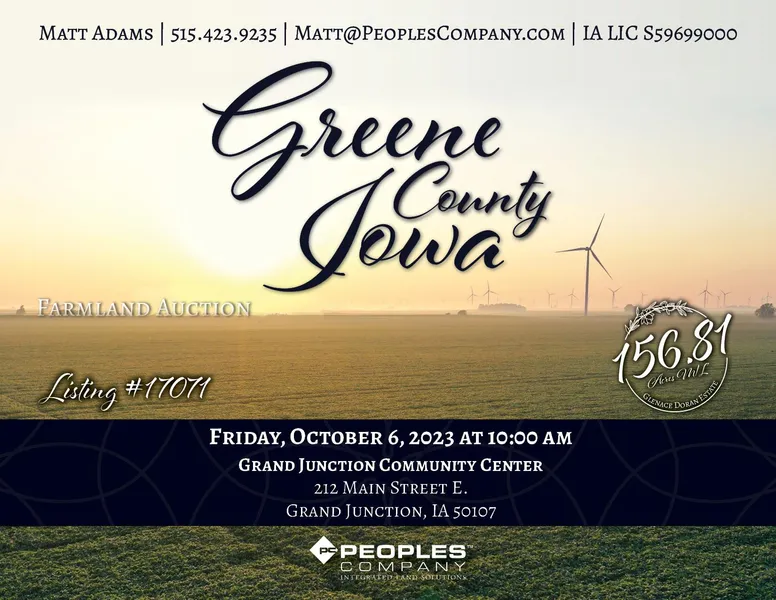 Greene County, Iowa Land Auction - Mark your calendar for Friday, October 6th, 2023 at 10:00 AM! Peoples Company is pleased to represent the Glenace Doran Estate in the sale of 156.81 acres m/l of exceptional Greene County, Iowa farmland. This highly tillable farm consists of 156.81 acres m/l with 152.02 FSA tillable acres m/l, carrying a CSR2 soil rating of 82.1. This premier Greene County, Iowa farmland tract contains top-producing soil types of Webster clay loam, and Nicollet loam, which cover over 77% of the cropland acres and boast an impressive CSR2 rating of 89.5. This farm is located east of Grand Junction, Iowa on 210th Street / X Avenue; in the northwest quarter of Section 36 in Junction Township, Greene County, Iowa.