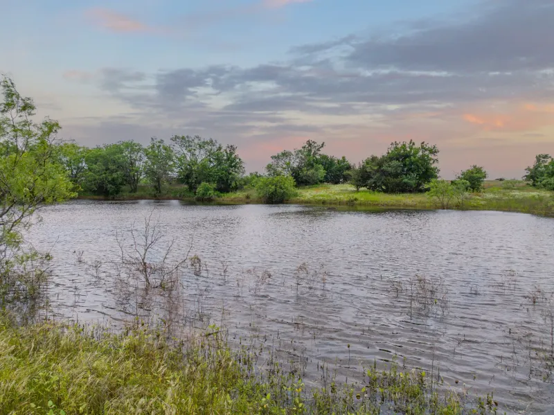 The ranch sits along a paved road with approximately 1,350 feet of frontage on Highway 2490, ensuring easy access. Beautiful, mature oak trees are scattered across the landscape, providing natural beauty and shade. In addition, a seasonal creek and a large pond enhance the propertys charm and appeal.