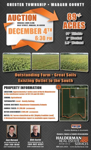 Legal Description: Part Of The NE1/4 Of S3, T29N, R7E, Chester Township, Wabash County, State Of Indiana. Containing 90 Acres +/-.