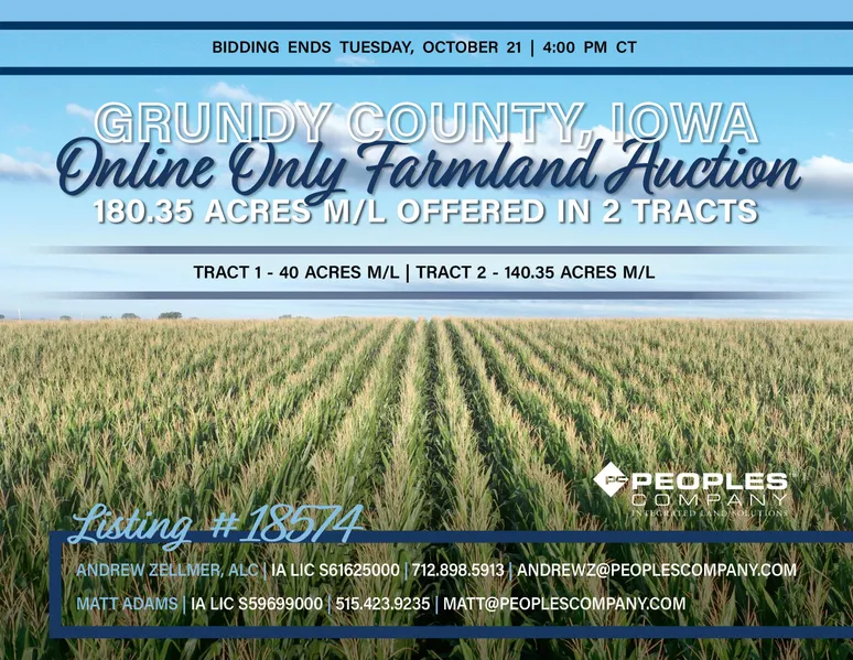 Offering two tracts of Grundy County, Iowa farmland through a TIMED ONLINE ONLY auction where all bidding must be done online through Peoples Company's bidding application. Bidding is currently LIVE and will remain open until Tuesday, October 21st, 2025, at 4:00 PM Central Time Zone (CST) with closing taking place on or before Friday, December 5th, 2025. A bid placed within 3 minutes of the scheduled close of the auction will extend bidding by 3 minutes until all the bidding is completed. If you plan to bid, please register 24 hours prior to the close of the auction for approval to bid. The Seller has the right to accept or reject any and all bids. Under no circumstances shall Bidder have any kind of claim against Peoples Company or its affiliates if the internet service fails to work correctly before or during the auction.