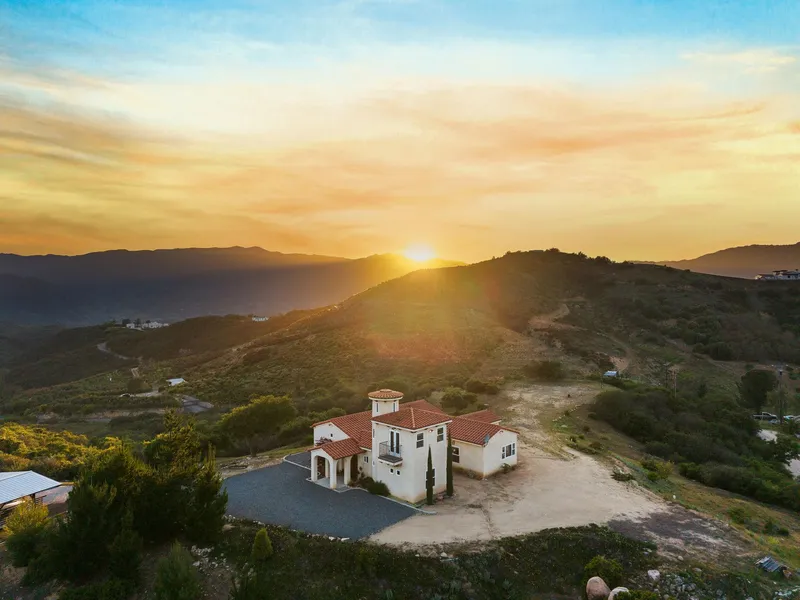 Tucked in the scenic hills of the desirable area of De Luz Heights in Fallbrook, awaits Hacienda del Sol, a stunning estate home situated on 10.09+/- acres. Inspired by the timeless elegance of Spanish Colonial architecture and effortlessly blending indoor and outdoor living, this custom-built 3-bedroom, 2-bathroom home offers an exceptional lifestyle. The name, Hacienda del Sol, perfectly reflects the sun-soaked beauty and expansive vistas that grace this remarkable property. From breathtaking Easterly sunrises to spectacular Westerly sunsets, the home provides a serene sanctuary where you can enjoy peace, privacy, and endless natural beauty.