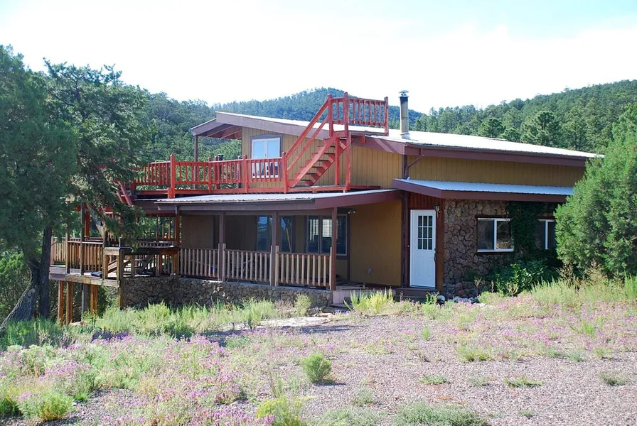 Enjoy amazing views from the upper deck of the Sawtooth Mountains, Alegre Mountain and Mangas Mountains. The property borders a Wildlife Study Area along its East boundary. Last Frontier is an upscale community, only 13 miles from Hwy 12 and 25 miles from Datil. The house contains very nice interiors, tile floors in the kitchen, reading area and hallway, and carpet floors everywhere else. There are 2 fireplaces (1 wood, 1 pellet), and stone walls. The living room has knotty pine and a stone access walls. There are 3 bedrooms plus a storage room and an office. On site well pumps into a 2,000 gallon indoor storage tank.