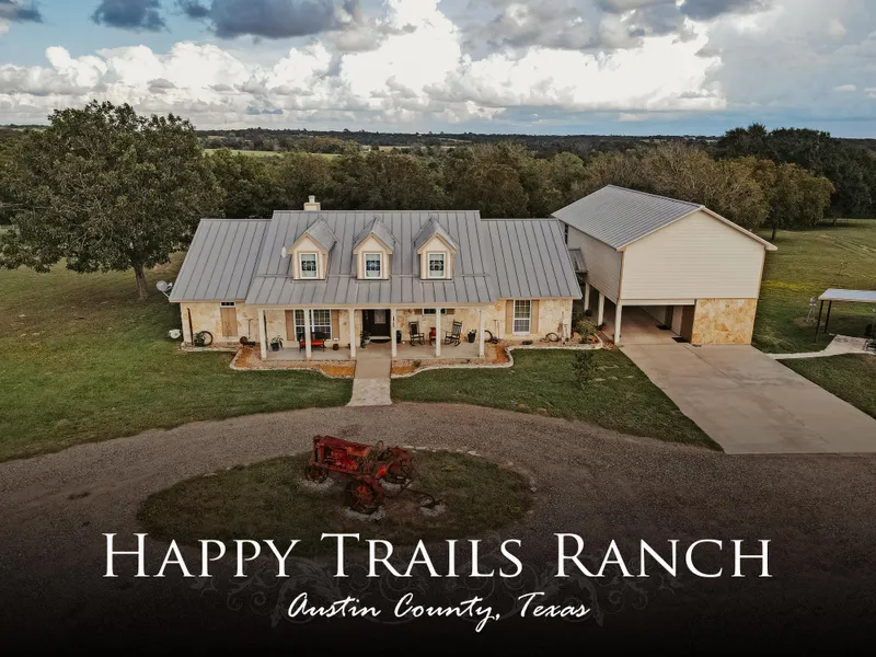 How often have you heard someone say that they are looking for a home with a hilltop view, scattered oaks, some pasture, woods to hunt, a pond, a live creek, a shop, and a horse barn. Well, look no further. Happy Trails Ranch has all of this and more on 25.82 acres. The 2358 SqFt country style home has 3BR, 2.5 Baths, open floor plan, split bedrooms, stone fireplace, covered porches front and back, a metal roof, propane, tankless water heater, and a stone and Hardie exterior, and an incredible view of the large pond and countryside out back. There is also a 1368 SqFt, 2BR, 1.5 Bath apartment attached to the main house with a 14 wide portico. Perfect for family, office, game room, or Airbnb. In addition, there is a 30X45 Shop with four 10 roll-up doors, a 30X30 horse barn with three 10X10 stalls and area for tack & equipment, a 10X16 storage building, and a 20X24 greenhouse. Also, youll find a beautiful, irrigated pond, scattered oaks and pecan trees, heavily wooded area, and a live, Buffalo Creek as one boundary of the property. Wildlife Ag Exemption in place. Minerals are negotiable. 7.4 miles from Bellville, 12.9 miles from Brenham, 2.7 miles from Kenney, and 70 miles from Houston.