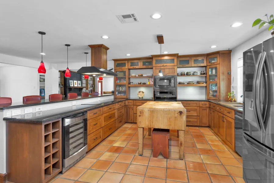 Welcome to this updated midcentury ranch on 4 acres. The heart of the home is the custom kitchen with Amish-built cabinets & oversized copper sink. The first floor has a primary ensuite with a walk-in closet, two more bedrooms, & full bath. The living room offers vaulted ceilings with wood beams, surround sound, & a brick fireplace framed by custom cabinetry. Upstairs, youll find two more bedrooms, full bathroom, office space, & game room, providing plenty of space for everyone. The backyard offers a peaceful oasis with extended patio, large pergola, & plenty of trees for shade & privacy. This property also offers lots of storage, including a 3rd car bay currently set up as an 11x22 darkroom. The 24x24 workshop with an additional 8x24 covered porch. Horses allowed!