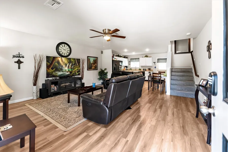 Welcome home! This fully furnished 2-story gem on a quiet street (with no through traffic) offers timeless curb appeal, full fencing with a gated driveway, and a prime location close to parks and schools. Inside, an open floor plan with neutral paint and LVP flooring features a spacious family room and casual dining area that flow into a spotless kitchen. The kitchen features crisp white cabinetry, sleek black appliances, a walk-in pantry, and convenient utility. Upstairs, a flexible loft is ideal for gaming or study, while the posh owner’s retreat offers a private ensuite and walk-in closet. Two roomy guest bedrooms and a full bath provide comfort and privacy for all. Energy-efficient features include a digital programmable thermostat, >15 SEER HVAC, insulated Low-E windows, and ceiling fans throughout. Furniture & appliances included. Outside, enjoy a fully fenced yard with a storage s...