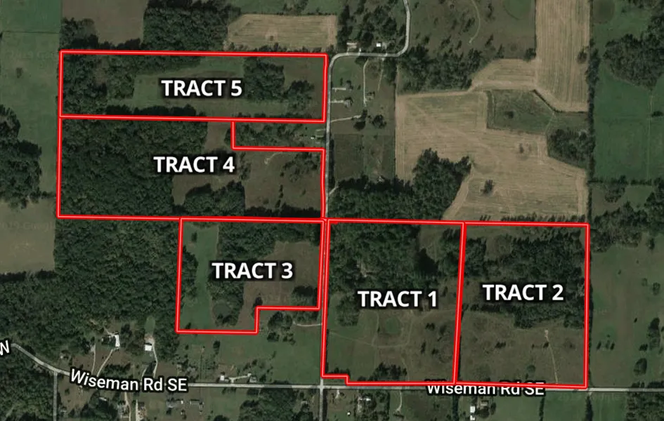 TRACT #2: 31.8 +/- acres, 1050 +/- of road frontage on Wiseman Rd, existing gas well, tract is 30-40% wooded with remainder in open land. Water-6 line along Wiseman Rd.