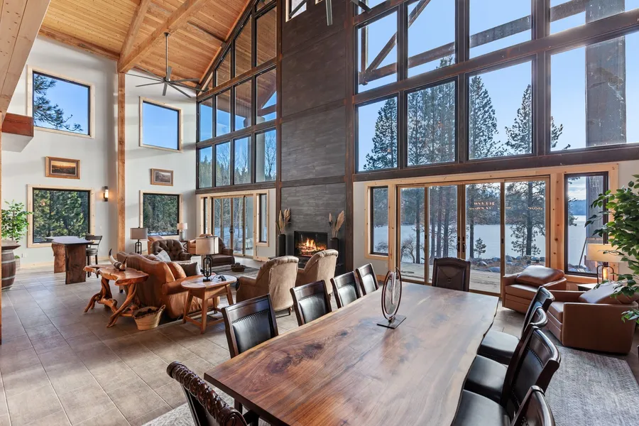 Welcome to the epitome of luxury lake living in North Idaho. Modern lake lodge with its own private peninsula boasting 517 ft of Hayden Lake waterfront on 1.13 acres! The perfect blend of rustic elegance & tranquility. 5 BR, 4.5 baths, 6900 sq ft w/huge entertaining great room addition on 1.13 acres. Lake views from expansive decks, bask in the comfort of NEWLY FURNISHED and MOVE-IN READY interiors, and unwind on your own private SANDY BEACH w/private DOCK. Sunsets, Trees, the water feature stream are incredible, where every detail speaks to the art of refined living. Gated entry. RV on site parking area. Complete remodel 2024. No HOA or CCR's. Come make this your lake life.