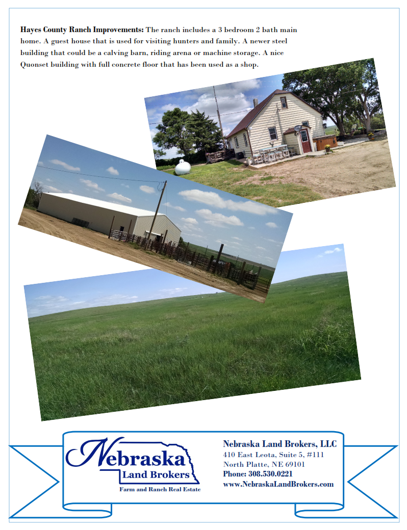SUMMARY: This is a very nice hard land ranch in western Hayes County, Nebraska. There is good county road access to the building site which includes the main house and a guest house. The Quonset has a full concrete floor and the newer steel building can be used as a barn or for machine storage. The ranch is currently leased out and the Buyer is looking to complete a 1031 exchange with the sale of this property.