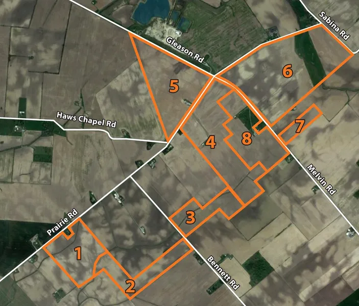 Building Description Tract 4: 30 x 32 Shed with 12 Overhead Door, 54 x 80 Morton Pole Shed (14 Eave Height), 32 x 64 Pole Shed (Open to South) and 26 x 90 Six Bay Morton Shed Tract 5: Wet Tank, 18 Diameter, 5 Rings, 2,500 Bushel, Two Grain Bins, 18,500 Bushel Capacity Each, 7.5 Rings (37,000 Total Bushels), Plus Farm Fans AB-270 Grain Dryer Tract 8: Four Grain Bins, 5,000, 7,500, 7,500 and 10,500 Bushel Capacity (30,500 Bushel Total Capacity), 40' x 80' Block Building, 2,500 Bushel Wet Tank, 12 x 60 Old Ear Crib, 28 x 40 Block Barn, 768 SF Tenant House with 2 Bedrooms, 1 Bath, 1 Car Detached Garage, 26 x 75 Pole Building, Back lane at 2829 Melvin Road