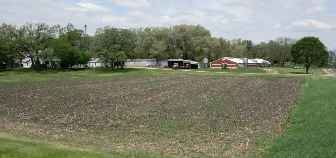 House; barns with attached sheds; 30' x 80' poured concrete silo with perforated floor and 15 hp fan; 20' x 70' Harvestore w/grain system and 15 hp 3-phase fan; 95-100' grain leg; machine sheds; crib; hog confinement buildings; and hangar