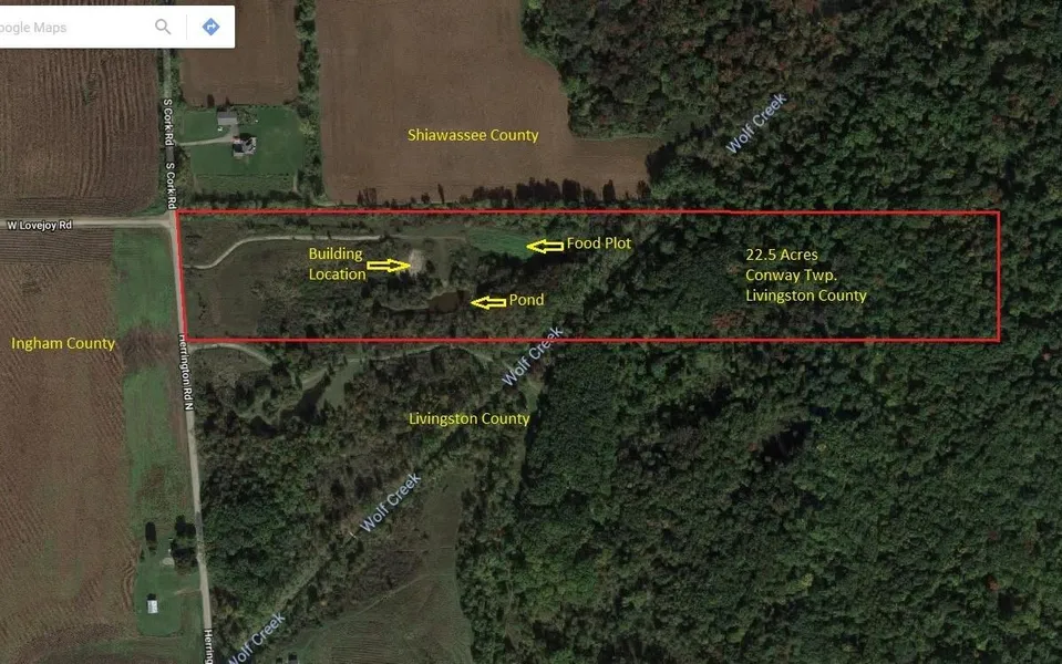 Located at the corner of 3 different counties and just into Livingston County, this 22.5 acres truly has a lot to offer! There is an established drive/path from the road, a nice dug pond approximately 12ft deep stocked with fish and a great building location for that next dream home in the country! There is a natural water source with Wolf Creek running through the property, rolling hardwoods, thick brush for cover, a great trail system and an established food plot area to attract and hold both deer and turkey! I bumped deer and noticed a lot of trails & tracks while walking the property! Don't miss out and give Brandon Podolak a call today at 989-251-9060 for your private tour!!