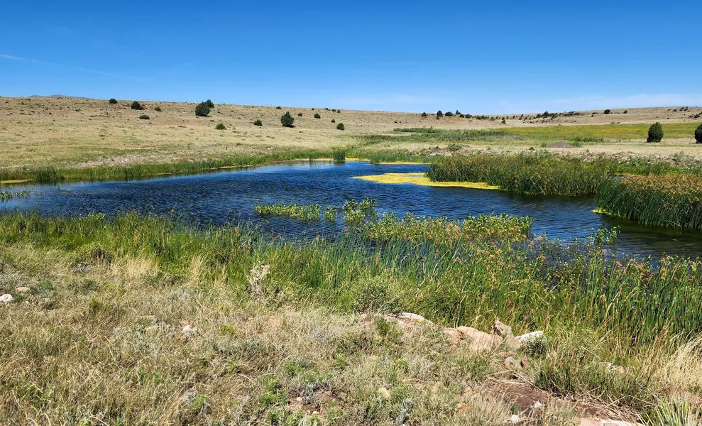 Permanent water is provided by the Hi Lo Spring that feeds the main pond. Water flows to a second larger pond that has been used to irrigate the meadow below the pond. The Hi Lo Spring has a declared irrigation water right and the New Mexico Office of State Engineers file No. is SP-2694. The NMOSE file indicates 18.55 irrigated acres with an annual allocation of 46.37 acre-feet. The ranch also has a strong solar well that provides year-round water for livestock and wildlife.