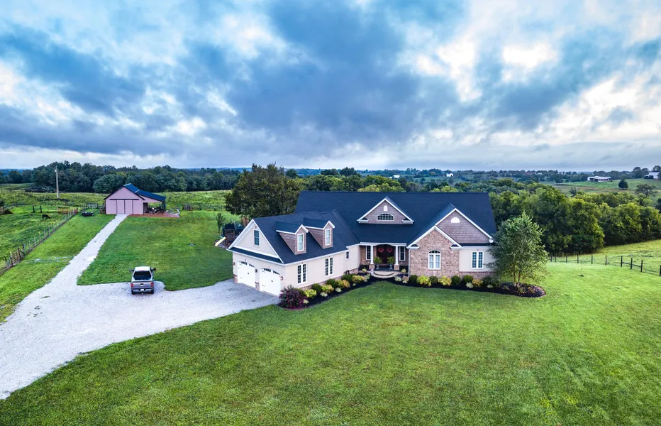 Stunning Masterpiece nestled off the road in the middle of 54+acres. This is a one of kind gem masterfully crafted with every detail well thought out. The home features a custom kitchen with ample cabinets, island, pantry & dining area just steps off the living room with vaulted ceiling, fireplace & built-in cabinetry. The master suite features a large bedroom, bath with separate tile shower, soaking tub and two walk in closets. There are 2 more bedrooms, full bath with double sinks, half bath, playroom/office with built-in cabinetry, bonus room, 2 car garage and full basement. Many custom features that you must see to appreciate! Watch the sunsets from the wrap around deck overlooking the backyard and acreage. On the 54+ acres you'll find a custom barn with cattle working station & room for tractor & side-by-side plus 4 ponds. Its fenced to run cattle now. You won't find many homes like this! Call today!
