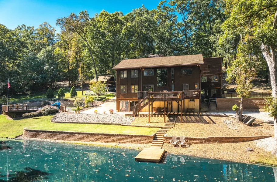 This stunning contemporary home, nestled on 14.57 picturesque acres, offers an exceptional waterfront view of a stocked lake, complete with a beautiful fountain. The lake is well-stocked with bass, bluegill, and catfish, perfect for fishing right at your doorstep. The main home boasts over 5,000 sqft of luxurious living space, designed to accommodate large families with ease. It features 4 spacious bedrooms, 4 baths, and breathtaking lake views from nearly every room. An entertainment room with a full bar offers the perfect setting for hosting guests. The outdoor space is equally impressive, with meticulous landscaping, retaining walls, and a serene park-like setting. There’s also a pool area, ideal for summer fun, and a detached 3-car garage with loft storage. Hunting enthusiasts will appreciate the mature bucks that have been harvested on the property, making it perfect for both huntin...