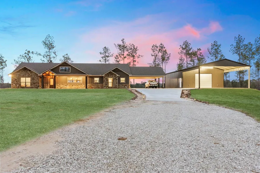 Experience tranquility at High Ridge Ranch with this stunning waterfront home! Completed in 2023, this 2,554 sqft custom residence features 3 bedrooms and 2 bathrooms, highlighted by a grand 14' vaulted ceiling in the living area. Enjoy abundant natural light and breathtaking lake views through large picture windows. The chef's kitchen boasts an oversized island, double oven, gas cooktop, and pot filler, with a walk-in pantry perfect for your coffee bar. The primary suite includes a luxurious en-suite bathroom with a custom tile shower, soaking tub, and expansive walk-in closet. Outside, you'll find an attached carport, spacious back patio, and a 30x40x12 workshop with a 25' gable extension. Deed restrictions ensure the development's pristine condition, with additional acreage available. Just 15 minutes from Lake Livingston, this home offers the ultimate country escape! High Ridge Ranch is unique in that it allows the restricted right to hunt exotic animals that roam the property! Call today for more information!