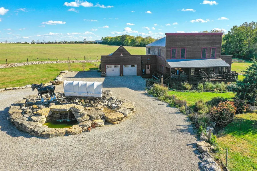 One of the most UNIQUE homes in Kansas City! Custom high-style cowboy home sits on a 50+/- acre ranch five minutes from Leawood! Enter the custom metal gates, pass the spectacular wildflowers and vintage red horse barns to the circle drive with gorgeous stone waterfall! Welcoming covered porch with wagon wheel railing feels like a dude ranch in Montana! Throughout the home is tongue-and-groove aspen ceilings and walls, and Mexican tile. Two master suites, stone fireplace, saloon doors, soaring ceilings, sun room! Balcony features office/sitting area, wet bar and overlooks the great room. Master bath has clawfoot tub, pull chain toilet, and massive stone shower. Master has enormous walk-in closet, stone fireplace and opens to screened porch. Two story great room has stone fireplace and wagon wheel fixture. Finished basement has a family room with wet bar, full bath, two bedrooms (one non-conforming.). Perimeter of property is lined with cedar trees. Perfect set up for horses with pipe fenced runs and auto waterers. Sanctuary for wildlife and enjoying nature. Convenient to shopping & restaurants. Finished basement has a family room with wet bar, full bath, two bedrooms (one non-conforming.). Perimeter of property is lined with cedar trees. Perfect set up for horses with pipe fenced runs and auto waterers. Sanctuary for wildlife and enjoying nature. Convenient to shopping & restaurants.