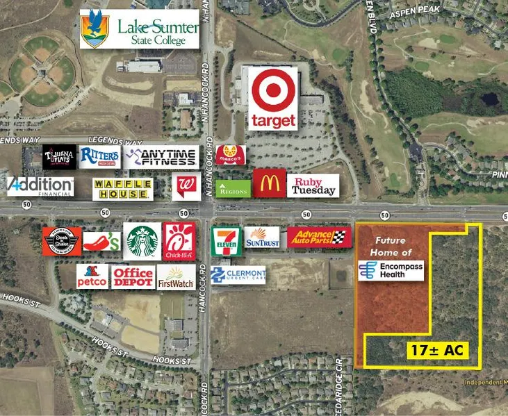 Do not miss this rare opportunity to own 17 acres on HWY 50 (17 acres available; estimated 15 net acres after Hooks Street extension), in the bustling City of Clermont, FL. Encompass Health will be constructing a 50 bed in patient physical rehabilitation hospital on the western border of the subject site. This site is centrally located in the economic power district of Clermont, surrounded by residential and commercial uses. Large acreage on HWY 50 inside the Clermont City limits has become a rarity in Clermont. This is your opportunity to get it while it lasts!