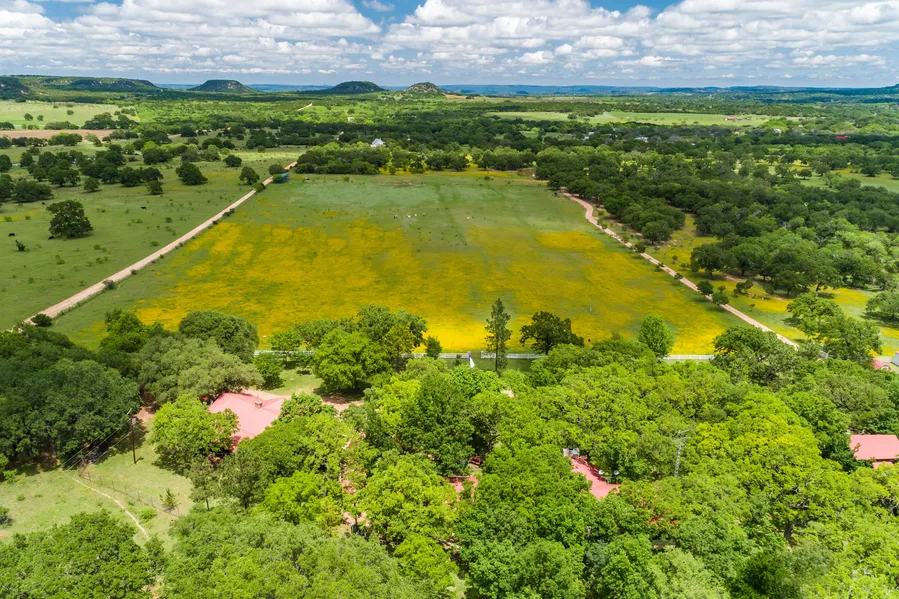 Shooting Star Ranch is a gorgeous acreage property located just north of Fredericksburg. Mature Post oaks are found throughout the property and a 14-ac improved pasture sits adjacent to the main compound. The main home is 2,700 SqFt with 3 BR/2.5 BA, great room, family room, spacious kitchen, and a large wood decked front porch. There is a detached 6-car garage with 5 open stalls on the back for equipment storage. There is also a 170-yr old cabin constructed of hand-hewn logs that was previously utilized as a B&B. In addition, there are 2 loafing sheds for horses and a detached pole barn.
