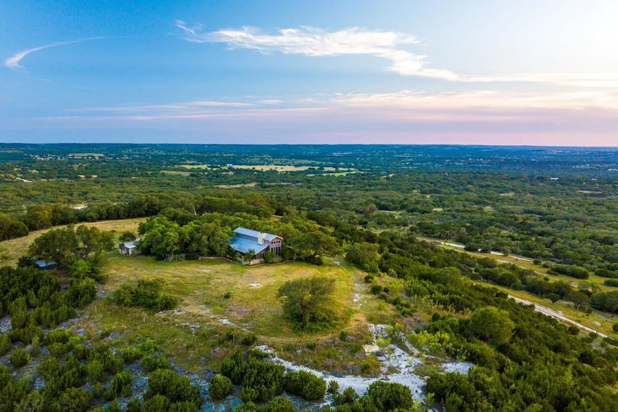 The ranch is very private and tucked away on a very scenic country road. It has some of the most fantastic 360 degree Hill Country views in Central Texas, with the main 3 bedroom home perched on a hill with unencumbered views in every direction. It is on an elevation of over 1,800 ft. The 2,840 sq ft hilltop home has a stone and cedar finish, and some very nice updates inside. The kitchen has been updated with granite countertops, gas range stove, and stainless appliances. Three stone fireplaces are within the home, and it also has multiple outdoor porches, with one having an outdoor shower.