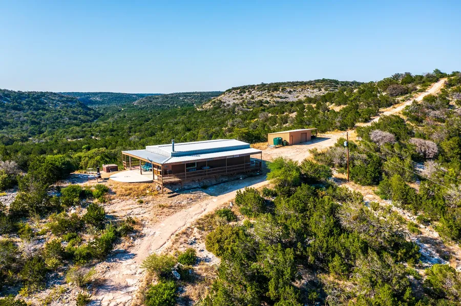 Discover a stunning 963.43-acre Western Hill Country ranch, situated at the end of a deeded easement road, perfect for extreme privacy. With +/-300 feet of elevation changes, this diverse landscape features breathtaking hilltop views, seasonal creeks, rock outcroppings, and over 80 caves. The main house offers 1,500 sqft of comfortable living space, complete with a wrap-around porch, bar, and hot tub. Just down the hill from the main house is a fully restored 1920s ranch house. The property also includes a historic shearing barn, two water wells, electricity, and high-speed Wi-Fi. Ideal for outdoor enthusiasts, the ranch is a wildlife haven, offering excellent low fence hunting opportunities and miles of trails for hiking, rock climbing, and exploring.