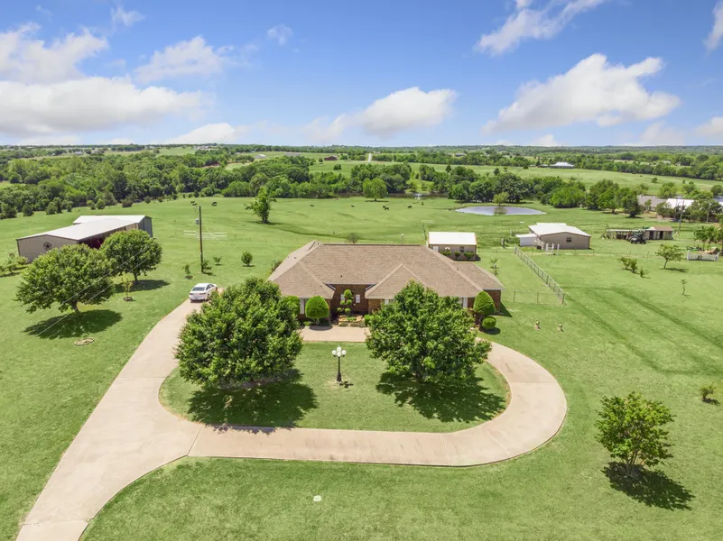 Amazing 10 mile hilltop views and private lake access are yours with this incredible Grayson County property. This property is located just northwest of Whitewright in a uniquely hilly and scenic area. The immaculately maintained custom home features a split bedroom arrangement with a HUGE master suite with private access to the wonderful screened porch and expansive patio area. The home was thoughtfully planned and built with 2 x 6 exterior walls and a piered slab foundation. The listing fronts on a beautiful 18 acre soil conservation lake. The property also has a shop building of approx. 360 square feet as well as a large barn and RV or boat storage and currently has an agricultural exemption for low taxes. New roof just installed!
