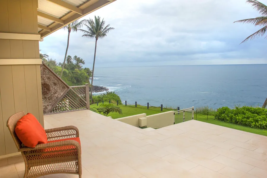 In the kitchen youll find a spacious original pantry alongside Jenn-Aire and Bosch stainless steel appliances, Caesarstone premium quartz counter tops, and a kitchen island. The overall kitchen design is open to the living area and offers unobstructed ocean views. The living room offers a comfortable place to relax while enjoying the unobstructed ocean views. Step outside onto the large porcelain tiled lanai a perfect spot to watch for migrating whales or enjoy the cruise ships passing by in the evenings. Beyond the lanai is a large lawn that stretches to the cliff.