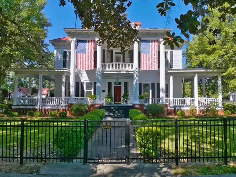 Nestled in the heart of Moultrie under the moss draped oak trees is your chance to own a piece of Colquitt County history. Spanning two stories and over 5000 square ft. The Barber Tucker House sits on a corner lot on almost an acre. This stately home was built in 1904 and showcases classic architecture. Over the years The Barber home has evolved from a beloved family estate to a Bed and Breakfast. It is primed for a variety of possibilities. Many weddings and special events have had the privilege of using this home. The Barber Tucker House is ready for its next chapter. Whether you envision such a beautiful home as a private residence. event venue, Bed and Breakfast, innovative office space its expansive layout and prime location to downtown offers limitless possibilities. The grand wrap around porches are welcoming where you sit with your glass of sweet tea and your favorite book. Step through the beautiful front door into the grand parlor with fireplace or library with built in book cases and fireplace. The formal dining and parlor join with solid wood French doors. Dining room can accommodate your largest dining table. Built in original china cabinets and fireplace with original tiles. Another fireplace is located in the large kitchen with breakfast area. The stainless appliances stay. Nice working island to help with entertaining. Laundry room , bedroom and bath downstairs. Up the grand staircase are four large bedrooms that have their own private baths. Lots of storage. Sitting area with large original desk/cabinet. On the grounds is a carriage house with two guestrooms with baths. Center room has brick floor and excellent for apartment/office or man cave. In ground pool and hot tub . Storage buildings and courtyard for entertaining under majestic oaks. Privacy fence in back yard with brand new wrought iron fence around front and side with electronic gate at drive. Ample parking space and new heating and air units. Owner will leave a lot of the furniture that was bought for the home at an extra price if buyer is interested. Located close to Olympic diving facility and Arts Center. This grand home can be viewed with appointment.