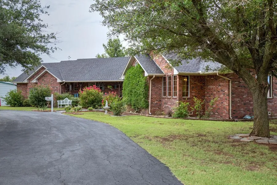 4880 N State Hwy 5 - Waurika, OK - Country Oasis! Youll have to see it to believe it. This 2 Acre - Quality 3bedroom, 3 full bath home checks every box from the picturesque curb appeal, grand feel of the cathedral ceilings, real hardwood floors and Oklahoma views youll find yourself right at home. Entry leads to formal living and dining with cathedral ceiling, natural light, cozy wood burning fireplace, hardwood floors and plantation shutters throughout. Kitchen is perfect for entertaining with dine in bar and open den. Huge walk-in pantry, all new appliances (1 yr), granite countertops, and plenty of cabinet space. Private master offers oversized walk-in closet, 5x7 concrete safe room doubling as a closet, stand-alone shower, jacuzzi tub, double sinks, makeup vanity and French doors to private back patio. Office is a dream with built-in bookshelves. Laundry offers cabinets galore, and mudroom/3rd full bathroom. As you pull onto the asphalt circle drive, youre welcomed with Oklahoma crape myrtles, manicured lawn and a front porch for coffee or cold iced