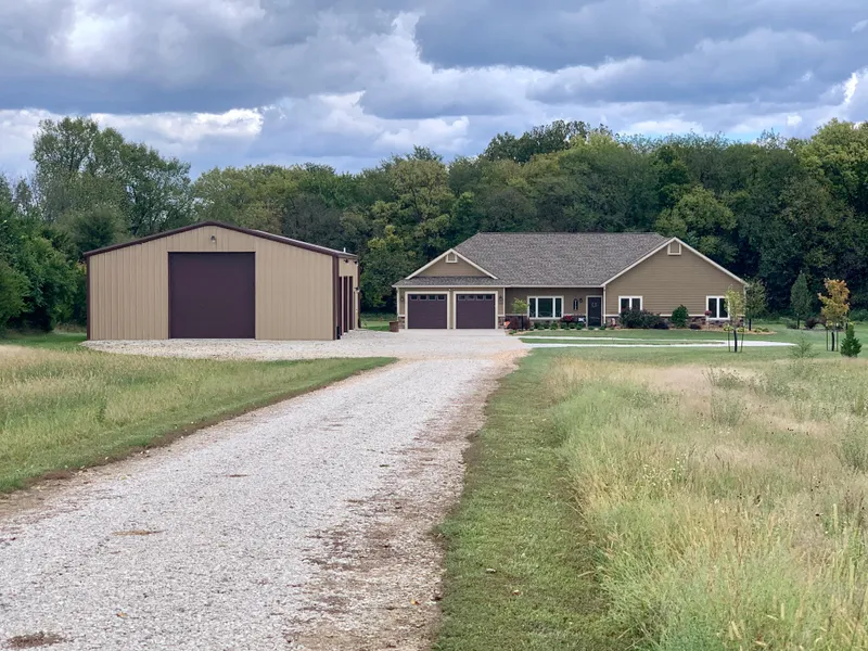 Finally, everything on 1 level! No steps! Just outside Lawrence city limits on 10.53 acres near Clinton Lake & Eagle Bend Golf Course. All Hardie concrete siding. 10 ft ceilings & open floor plan. Low bills! Heated floors everywhere plus traditional forced air heat & AC. Living areas = family room, rec/game room, wet bar, Media & more all on one level. Concrete room has steel door. Huge 2-car garage has room for storage. 60x40 dream outbuilding has concrete, 3/4 bath, shop, 200 amps pwr, & 4 overhead doors. 4th bedroom has office cabinets. House has 200 amps of power and garage has 200 amps of power.