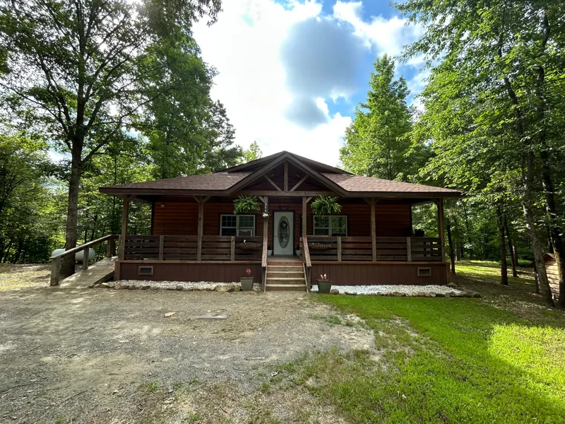 Introducing a beautiful 2.2 acre property situated on a dead-end county road overlooking the Mountain Fork River in Western Arkansas. The focal point of the Polk County property is a cabin-style home with 1,600 square feet featuring three bedrooms, two baths, and a conveniently located utility room off the kitchen and primary bathroom. From the front of the property, you will notice a welcoming 840 covered front porch with a wheelchair ramp. Once you enter through the front door, you are drawn to the combination of rough-cut beams and vaulted wood ceilings that lie over the living room and kitchen. In the kitchen you will find custom wood cabinets, eye-catching live-edge wood countertops, and an island. The home offers a large primary bedroom with a walk-in closet accompanied by a spacious bathroom with a custom-tiled walk-in shower. On the north side of the home, you will find two guest bedrooms with a shared bathroom.
