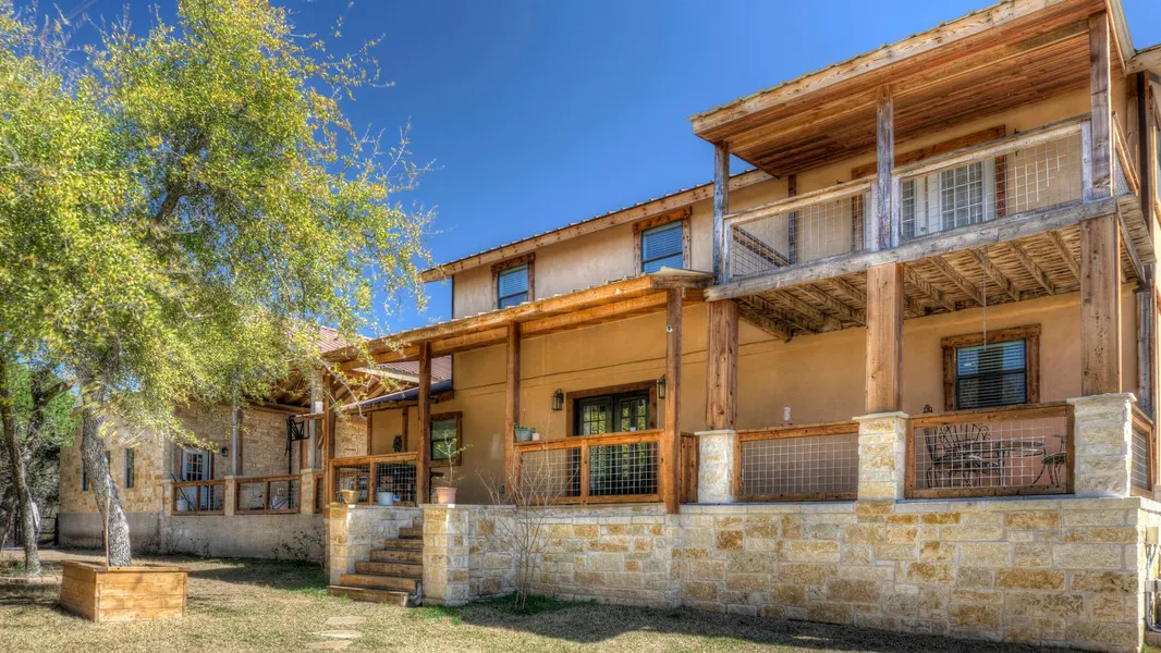 Lovely Hill Country home with a modern farmhouse design built in 2014 on a sprawling 2.8 acres. Encompassing 2760 sq.ft. of living space with hardwood floors throughout. The interior features an open kitchen/dining area with concrete countertops, a center island, a bar with additional seating, and stainless-steel appliances, including a gas range and under-counter beverage cooler. The primary suite blends comfort and luxury with a seating area, fireplace, walk-in closet, and French doors that lead to a private balcony from where you can enjoy the stunning views of the surrounding hills and the pool below. The primary bathroom is thoughtfully designed with dual vanities and a walk-in shower featuring dual shower heads and a glass enclosure. The study is adjacent to the primary suite, and the additional three bedrooms offer plenty of living space. Step outside to discover a large, covered ...