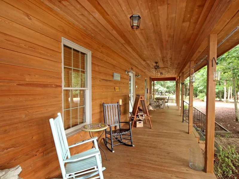 The wrap-a-round porches all have room for comfy furniture, and are large enough for you to sit on one porch and not even realize that the nearby porch is occupied. The sounds of the birds, crickets and frogs are many times the only reminders that you are not alone. It is simply charming. Come see for yourself!