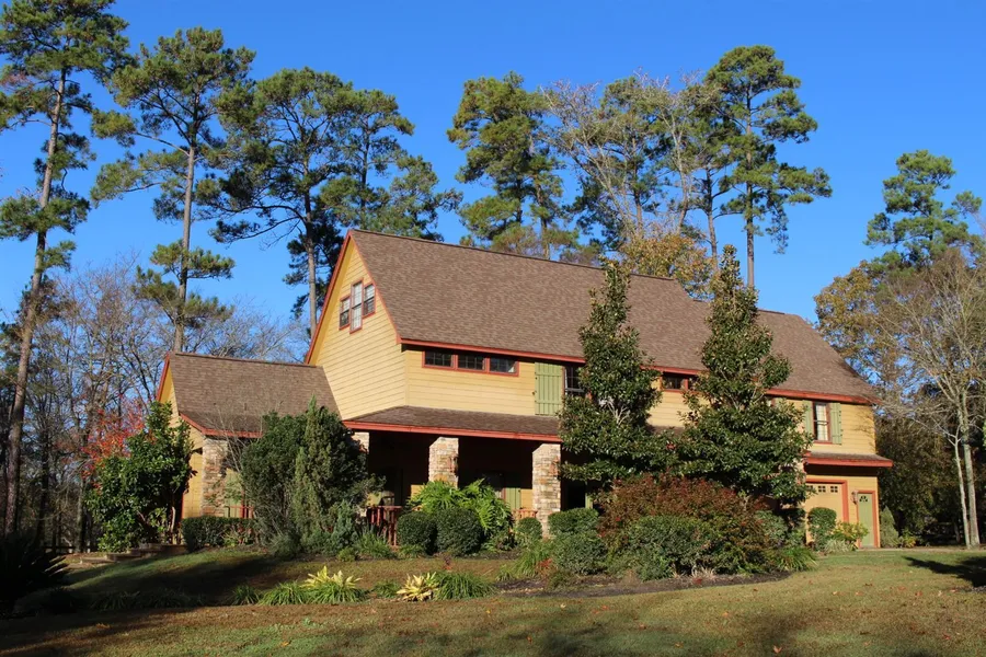 Hope Park - 5 secluded acres with a 4400 sq ft contemporary home. 3 bed, 3 bath, 2 half baths, both formals, office. Guest suite with separate entrance and kitchen. Large covered porch, multi-level deck, extensive landscaping. 2 car garage with shop area and pet run. 2 stall barn, storage building. Easy access to I-45; close to historic Montgomery and Sam Houston National Forest. Sensible restrictions, horses allowed. Serene park-like setting - hardwoods & grass. Come home to Hope Park.