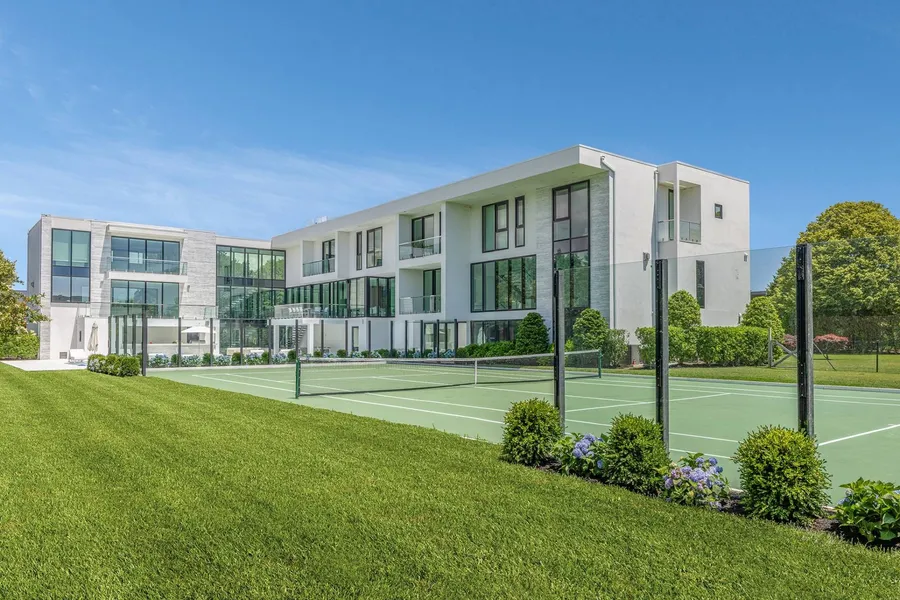 Far South of the Highway in Bridgehampton, on a quiet, exclusive cul-de-sac, stands a spectacular new modern home that is nothing short of revolutionary. Exceptional does not begin to describe this residence's quality of construction and level of detail. The home is a fortress, built of stone and steel, not wood, with concrete floors reinforced by steel beams, able to withstand 200 mph winds, and is fire-, mold-, and termite-proof. Magnificent walls of glass, windows, and doors by internationally regarded German manufacturer Schuco, fill the interiors with light. Floating stairs inside and out enhance the feeling of space, light, and air. The finest materials and finishes achieve a level of beauty and perfection not found elsewhere. Marble is an essential component of the interiors in baths, walls, and flooring. White Crystal Thassos marble flooring is throughout and also surfaces outdoor patios and paths (sandblasted). Custom kitchens, vanities, and closets are by Ciuffo Cabinetry. The residence encompasses 9 sumptuous ensuite bedrooms including primary suites on the first and second levels. On the upper level, the private grand primary bedroom suite has separate luxurious dual baths and expansive closets, and enjoy a grand view of the property and its surrounding landscape. Designed for seamless indoor/outdoor living and entertaining, the home includes a gourmet kitchen and a complete chef's prep kitchen, with Italian high-gloss cabinetry, Glassos island and countertops, Thermador appliances, 2 Liebherr refrigerators and Miele dishwashers. Exteriors boast a full outdoor kitchen and bar seating 10, a 20'x45' heated gunite pool, spa, and cabana, plus tennis. Bring the celebration up to the sky where a spacious 1,000+/- sq. ft. rooftop deck with glass railings captures incredible panoramic views of the ocean and Sagg Pond - you see, hear and smell the sea from this aerie.
