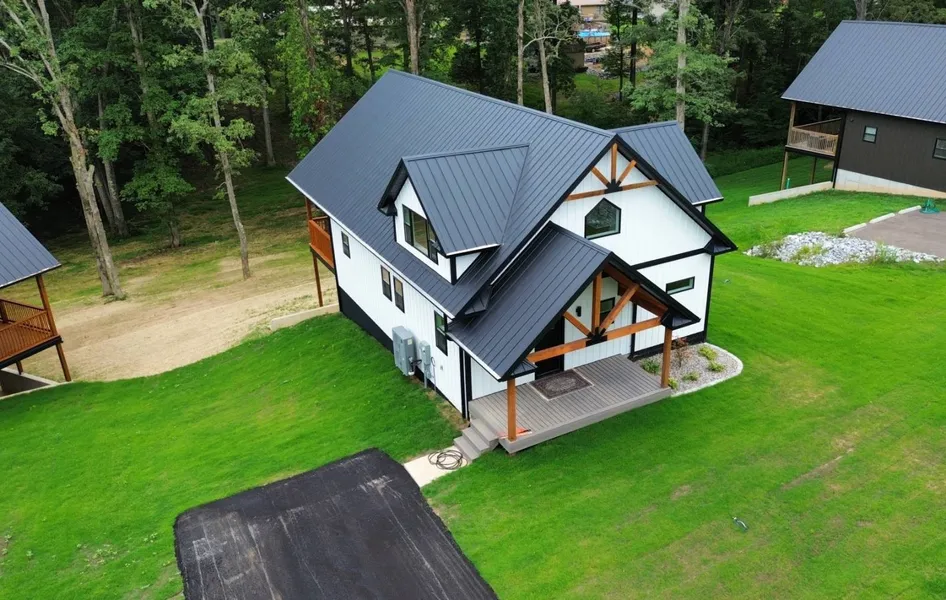 Located adjacent to Cypress Bay Marina on Kentucky Lake, approximately five (5) miles from Paris Landing State Park, and approximately six (6) miles from US Forest Service Land Between the Lakes National Recreation Area. One hour and forty minutes to Nashville, TN. Located in Henry County, one of Tennessee's top places to retire. Kentucky Lake is one of the largest man-made lakes in the United States. Custom built-contemporary, rustic home with full walk-out basement. 3022 heated and cooled luxurious living space. 3 bedroom, 3 1/2 bath with office area. Includes all stainless steel appliances: Refrigerator, dishwasher, microwave, wine cooler. Amenities include the following: open floor plan, custom built-ins, custom kitchen cabinets, large center kitchen island, quartz counter tops throughout, vaulted rustic pine cabin grade wood ceiling, custom window in den area, electric fireplace and large TV in den, custom built bannister to the second floor, heated basement floor, beautiful custom wet bar in basement, walk-in showers, walk-in closets, double vanities in primary bath, storage area under the stairs in basement, engineered flooring and tile, on-demand water heater, sliding glass doors open to upstairs large wood covered deck,and concrete patio at basement level. Paved driveway, landscaping, metal roof, utility room with utility sink. Community water. High speed internet available. One year builder written warranty. Property joins TVA 375' elevation and building restrictions apply. Subdivision restrictions apply. This home delivers unbeatable value, location and lifestyle. Schedule your private showing today!