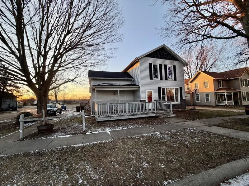 3-4 bedrooms and 2 bath (one on each level) home offers a large kitchen, formal dining room, main floor laundry room and a large deck. There is a cool bonus loft room above the kitchen that could be a home office, playroom or the 4th bedroom. The detached 2 garage has electric with a garage door opener; there is a storage shed behind the garage and a dog kennel. All located on a corner lot across from the town park.