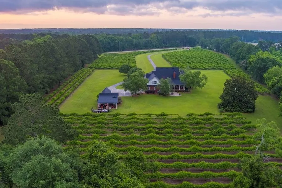WELCOME HOME to this custom built brick Southern Living Dream Home. Beautiful setting. Nestled among 5+acres of manicured, irrigated muscadine grape vines. Total of 11.1 acres. 4 bedrooms, 4.5 baths, bonus room and workshop. Lots of custom woodwork. Foyer entry. Heart pine hardwoods in halls, great room, dining, office and stairs. Powder room off entry hall has marble top vanity and copper sink. Formal dining features judges paneling. Office is adjacent to dining. Vaulted ceiling in great room, fireplace, and bookshelves. Wonderful kitchen. Solid surface counters, smooth surface cooktop, island seats 2, built in desk, SS appliances and tile floors. 6X8 walk-in pantry with wood shelves. Stores all serving pieces, small appliances,staple items and room for an additional refrigerator or freezer. Kitchen opens to breakfast room. Step down to light filled sunroom with tile floors. Large maste...
