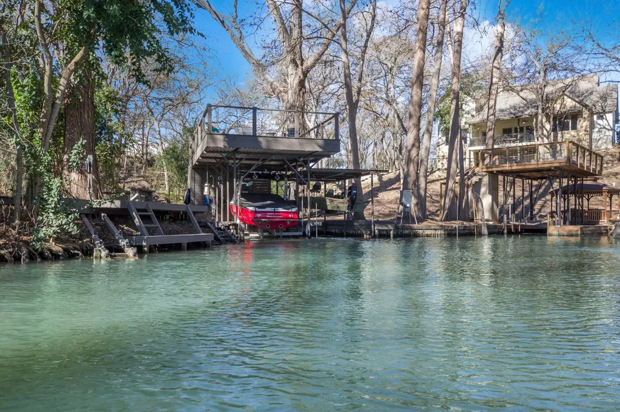 Amazing first class custom home in a prestigious gated subdivision on Lake Dunlap. Improved waterfront includes boat dock and two bay slip built in 2013 with an upper sundeck and large walk-in ski locker, jet ski ramps, and fishing pier with fishing lights. Perfect for entertaining with stained concrete and wood floors, double sided stone fireplace in great room/kitchen, and oversized outdoor covered patios. Open concept kitchen includes custom concrete countertops, soft-close cabinets, stainless steel island and a built in monogram refrigerator, DCS dishwasher, and capital cooking equipment 6-burner gas range and oven. Master bedroom is idyllic with gorgeous vaulted ceilings, lots of natural sunlight and double doors opening to patio. Spacious walk in closet and master bath with garden tub and his and her sinks. Large game room on lower level with a kitchenette and full bath. Lower property landscaped with river rock and limestone that includes a boulder fire pit, zip-line for maximum entertaining for kids. Oversized detached 3 car garage, fully fenced dog area. Backyard was sodded in June 2015 with shade tolerant Zosia grass, cove dredged in winter 2015, and trees trimmed in rear of property to enhance lake view from all rooms in the home.