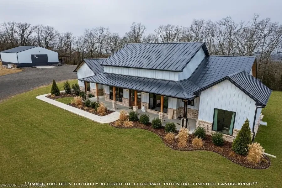 Welcome to this gorgeous new-construction home nestled on 40 peaceful acres in a rural setting just outside of Sallisaw. Step inside to an inviting open-concept living space featuring a cozy gas fireplace, gourmet kitchen, and spacious dining area—perfect for entertaining or everyday living. Light-painted walls, a striking wood-stained ceiling, and sleek black finishes beautifully complement the Black Walnut cabinetry throughout the home.